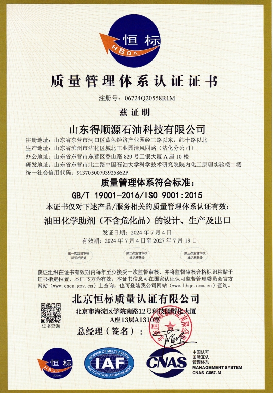 2024年7月4日,公司接到北京恒標(biāo)質(zhì)量認(rèn)證有限公司通知,順利通過了質(zhì)量管理體系、環(huán)境管理體系和職業(yè)健康安全管理體系認(rèn)證的再認(rèn)證審核,符合認(rèn)證標(biāo)準(zhǔn)的要求,繼續(xù)保持認(rèn)證注冊(cè)資格,證書持續(xù)有效。